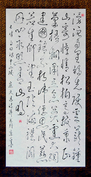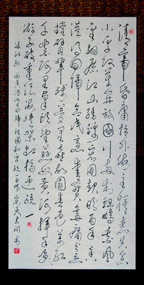 我的草书基本上书写我自己的诗词作品,如七律,排律,满江红等,我的一些作品都在报刊上发表的,古人的诗词我也写。因为写草书主要是写意境,自己的草书更容易发挥,我自己的诗词100首正准备出版并写出草书。 |