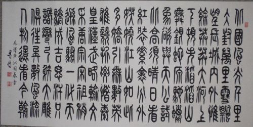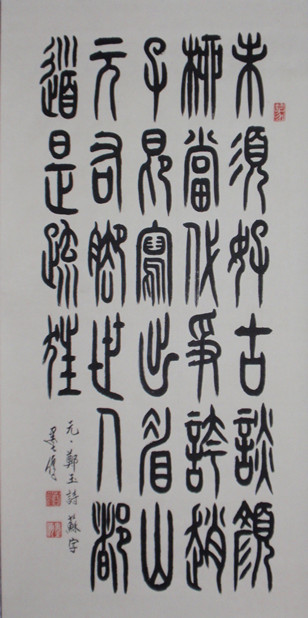 他从50年代至70年代,主攻书法、兼习绘画。70年代以来,又主攻绘画、兼习书法。他的草书,以追二王、孙过庭、张旭、怀素等大家,下摹王铎、傅山等神韵,形成了自树一帜的草书风格,他写的《墨儒草书唐诗三百首》,字体清新洒脱,劲健流畅,受到行家的称赞。他写的汉隶、韵味十足,写的李斯小篆,挺拔、秀丽。他的小篆(***理论),在2004年“记念***诞辰100周年全国书画大展”中,被评为银奖。更有成就的是:他历经几十个春秋的刻苦磨炼、探索、练出一种发墨书法,目前在国内外还没有这种写法。在84年时,一张2*4尺发墨字,就卖8000元人民币。这种书法,是一种新的创新。