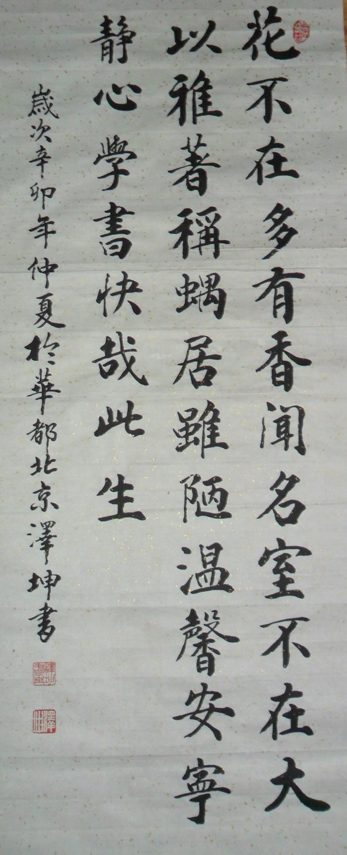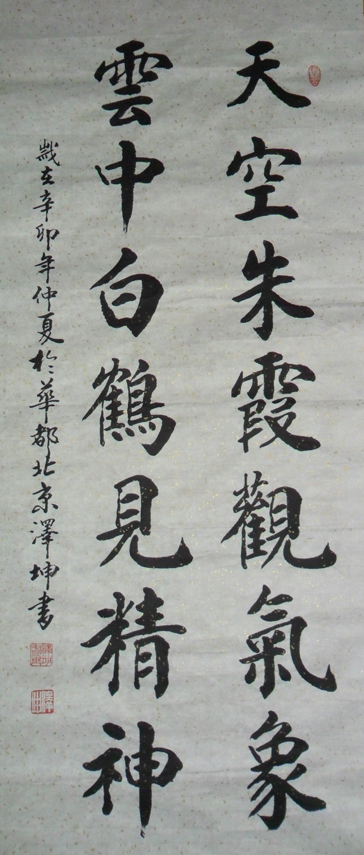 字泽坤。号兴鑫 从小酷爱书法,中年时期,临,古帖颜。柳,欧,赵,楷书为根基 后拜师书法名家,张易生,姜广业为师,92年,中央美院进修三年参加 过全国大型书画比赛,深爱书法名家好评,现任中国诗酒文化诗书画院院士。