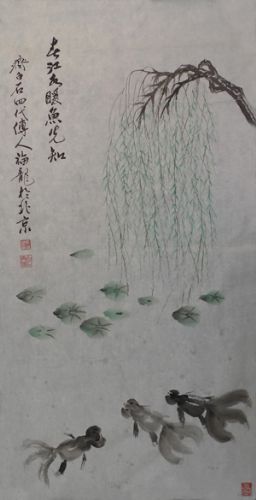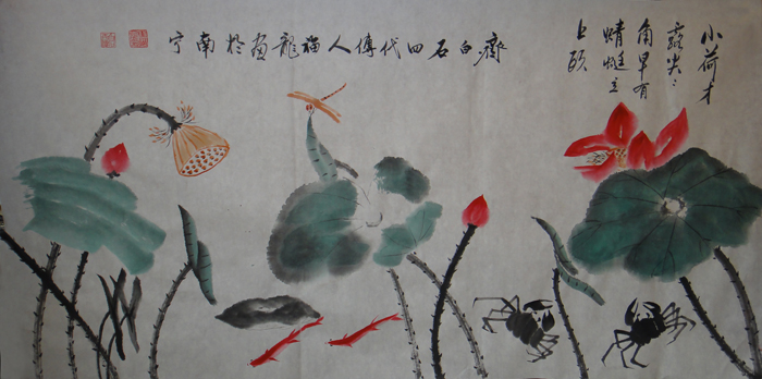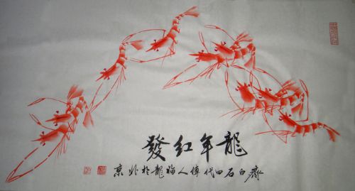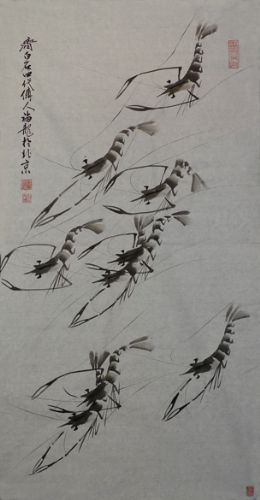 马福龙先生画虾,掌握了齐白石老人的技法,虾须的线条似柔实刚、乱而有序、韵味别致。宿墨表现,苍劲老道,一气呵成。加之高妙的书法功底,使笔下的虾寥寥数笔却生动传神,水墨过渡自然,虾的动感和质感更强。形成自己独特的风格,被藏家誉为“中国第一肥虾”。