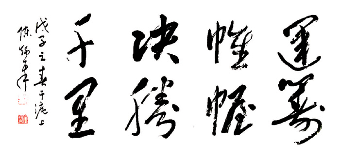 他在书法理念上,长期坚持师古不泥古,不独宗一家;坚持广为涉猎,博采众长,融会贯通,一笔书,连绵草,自成面目。至今,虽年过古稀,或写小字,或作巨幅榜书仍都得心应手。有专家评其书法,“雄浑豪放、遒劲畅逸、纵横潇洒、古朴凝重,姿态跌宕,在苍润浑朴的笔墨中郁勃生机,其综合艺术素质在笔墨间得以尽情宣泄,其美学价值在创作艺术实践中不断得以强化和升华,观其作品感天地间横生磅礴,堪称大手笔”。