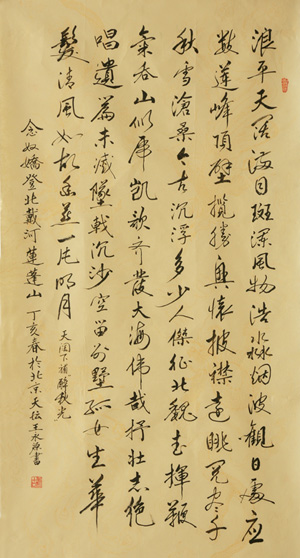 | 简介:男,出生于1934年,汉族。字“寿古”,室名“翰峰堂”,山东省寿光市人。自幼幼酷爱书画,潜心翰墨,临池不辍,书法四体皆工。书法学习四十余年。毕业于中国书画函授大学。其书法经过多年进修,并得到吴味淳、苏适、张旭等大家指导,作品曾获得中国全国总工会成立七十周年全国书画摄影艺术大赛一等奖、其他赛事的特别奖一次、一等奖三次、二等奖及优秀奖多次。还有许多作品被日本、韩国、泰国等博物馆收藏。现任山东省寿光市书画院研究会会长、中国书画函授大学寿光分校校长、中国国际书画艺术研究会会员、中国老年书画艺术研究会研究员、中国书法家北京市东坡分会会员、中国书画家协会会员、中国诗酒文化协会诗书画院一级书法家。 |